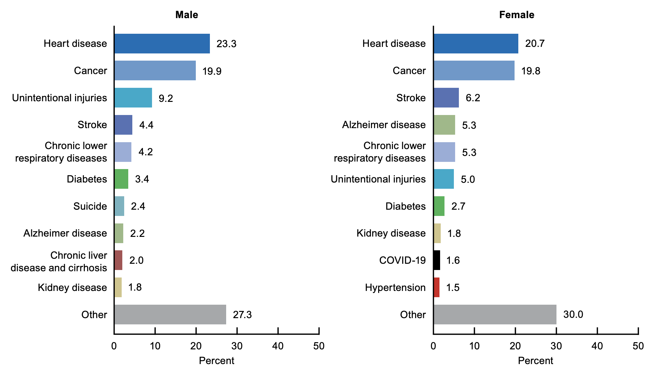 Percent distribution of the 10 leading causes of death, by sex: United States, 2023