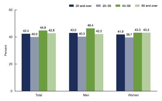 Prevalence of obesity among adults aged 20 and over, by sex and age: United States, 2017–2018